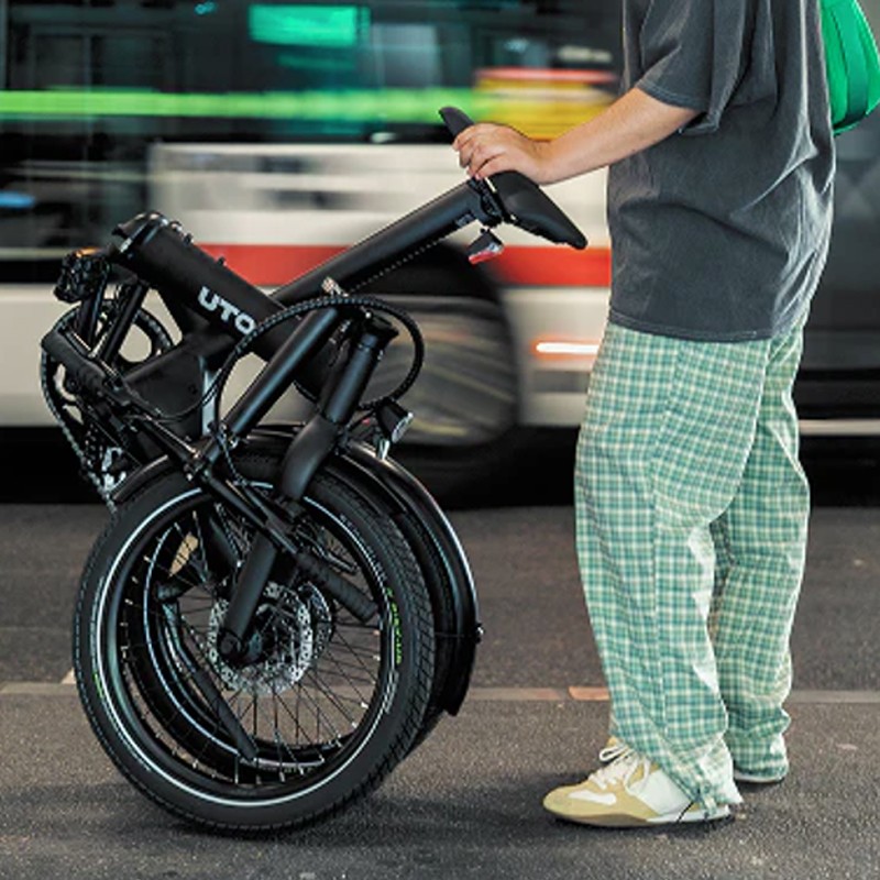 OG16 - UTO (ex eovolt Morning),Conçu pour être le plus pratique, maniable et léger de nos vélos UTO électriques. Il est idéal pour vos courts trajets et parfait pour combiner plusieurs moyens de transport.Pliable en 10 secondes, pesant 16,2 kg* avec sa batterie, avec une autonomie jusqu’à 50km. *poids sans pédales